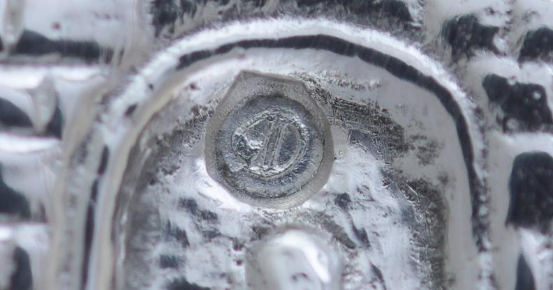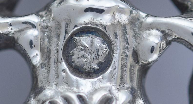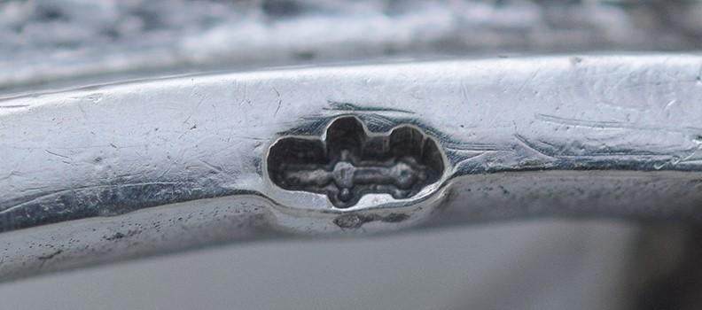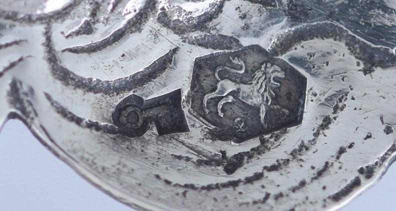 This piece is stamped with the Dutch lion passant for a minimum silver purity of 833, the key-shaped export mark, the duty mark of Minerva's head, the dagger-shaped small article guarantee mark, and a date letter of a Gothic G for 1891.