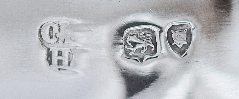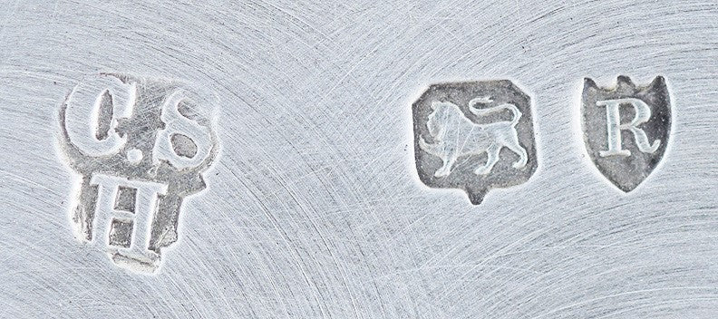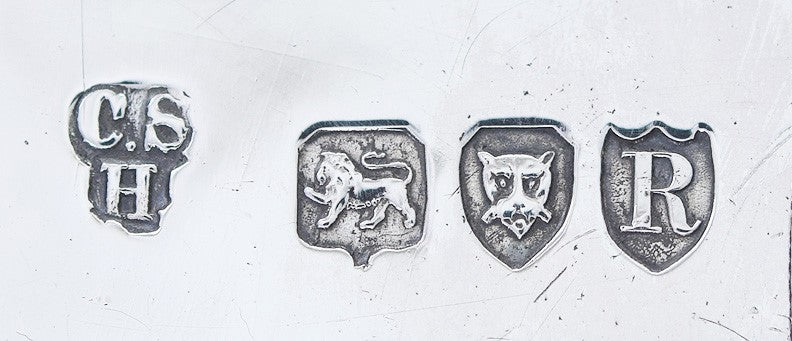 This piece is hallmarked on the underside with the lion passant for sterling silver, the leopard's head for the city of London, the date letter R for 1892, and the maker's mark for Charles Stuart Harris. Both oval inkwell holders are hallmarked on the side with the lion passant for sterling silver, the leopard's head for the city of London, and the maker's mark for Charles Stuart Harris. The inside of the lid of each inkwell holder is also hallmarked with the lion passant for sterling silver, the date letter R for 1892, and the maker's mark for Charles Stuart Harris. Even the bolts are hallmarked with the lion passant for sterling silver, and I can see part of the maker's mark on one of the bolts as well. Everything is 100% original.