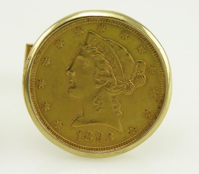 Presented is a wonderful quality set of American Liberty Head gold coin men's suit cuff links. Each cufflink is securely bezel set with an authentic, 1893 Liberty Head coin. The gold coins are 90% gold purity. The bezel mounting and toggle backs are 14 karat yellow gold purity.