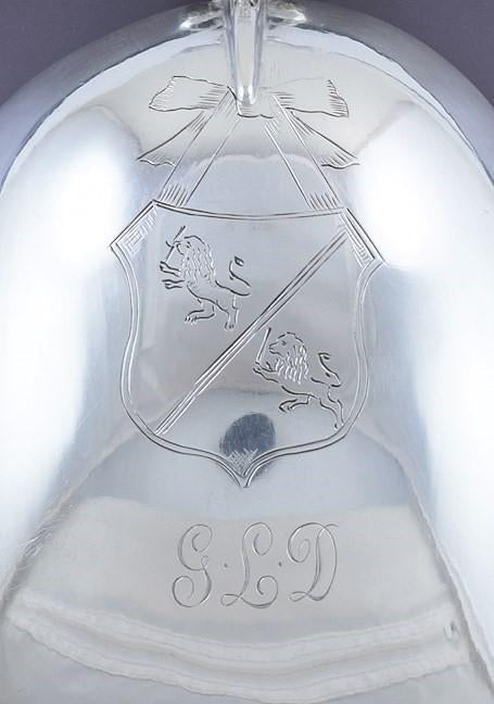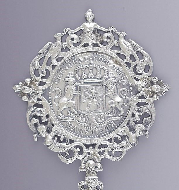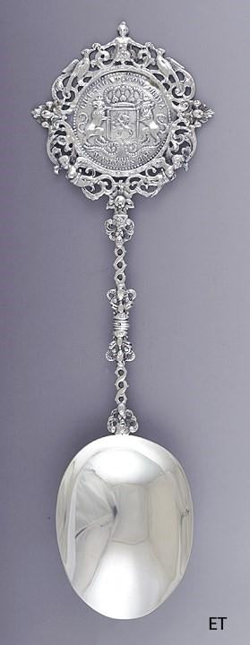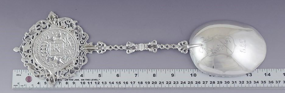 Presented is a wonderful Dutch silver serving spoon, dated 1895. The terminal of the spoon has a large medallion design like a coin, with a crest in the center of a rampant lion holding a sword inside a shield shaped cartouche, supported by two crowned lions, all beneath a crown. The medallion is surrounded by ornate decoration in the form of a mermaid or siren with pheasants, flowers, cherubs, and scrolled vines. The handle of the spoon is done in an elegant twist form, with little bow shaped decorations at various points along its length. The bowl of the spoon has an engraved crest on the back with two lions holding swords in side a shield, above a monogram of GLD.