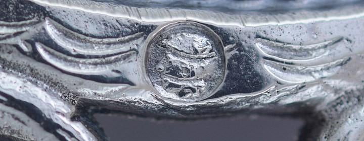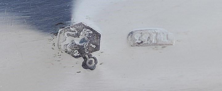 This piece is stamped with the Dutch lion passant for a minimum silver purity of 833, the key-shaped export mark, the duty mark of Minerva's head, and a date letter of a Gothic L for 1895.
