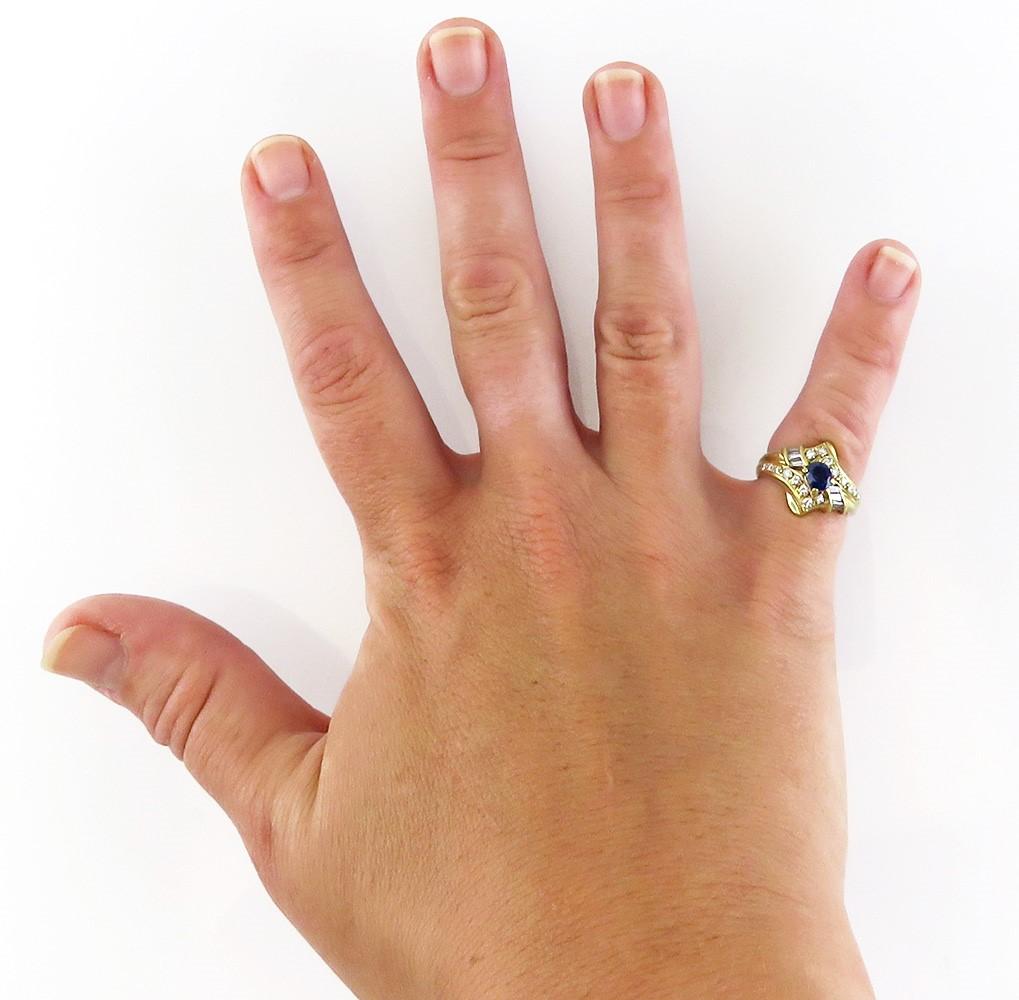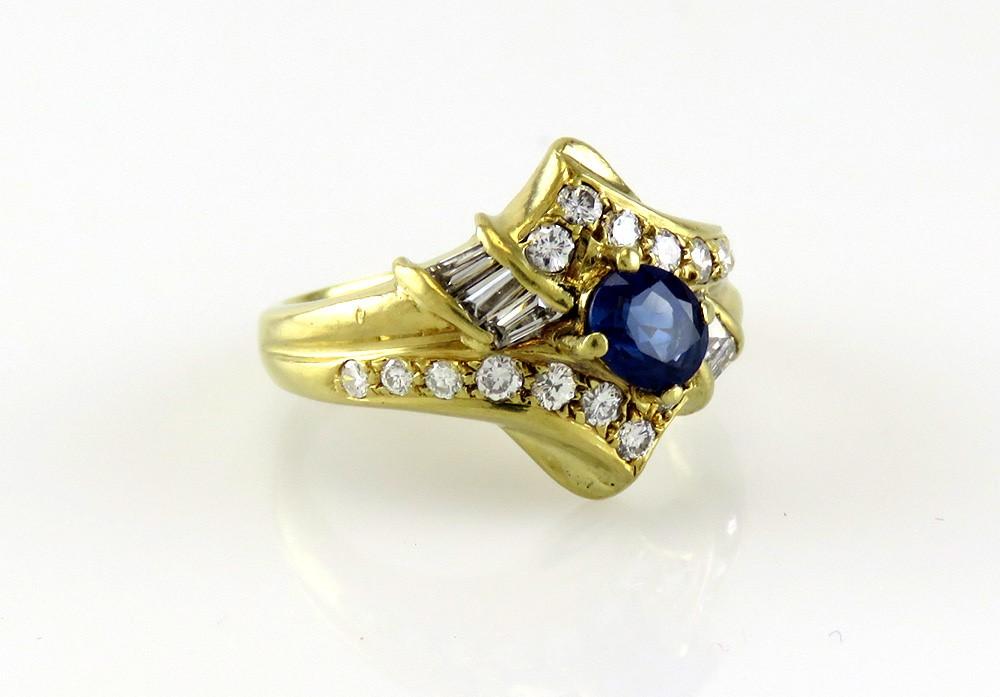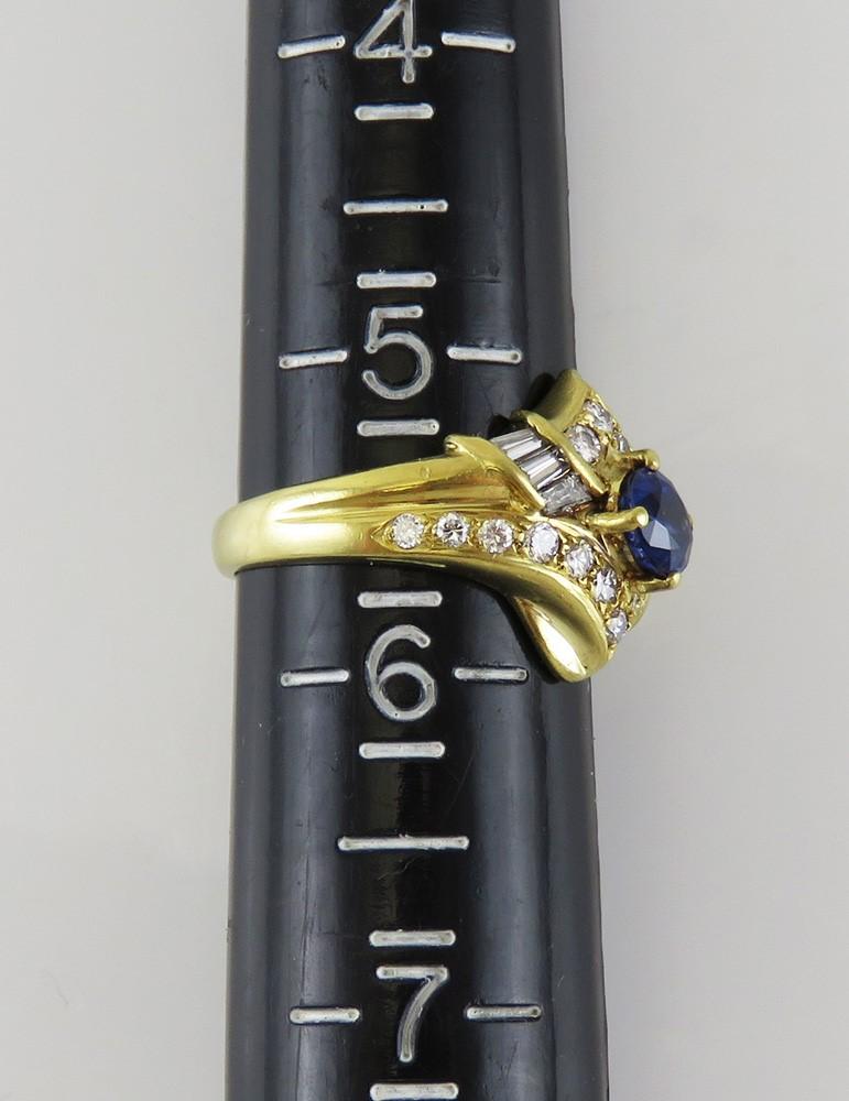 Presented is a gorgeous, 18 karat yellow gold, natural diamond and sapphire gemstone ring. This is a very high end piece done in an eye-catching form. The top is securely set with a .73 (or nearly 3/4) carat sapphire gemstone with a beautiful deep blue hue. The sapphire is surrounded by 16 round modern brilliant cut and 6 marquis cut diamonds. There is .61 (over 1/2) carat in total diamond weight. The diamonds are VS clarity and G color. The ring is a size 5 1/2 and it can be resized by a professional jeweler.
