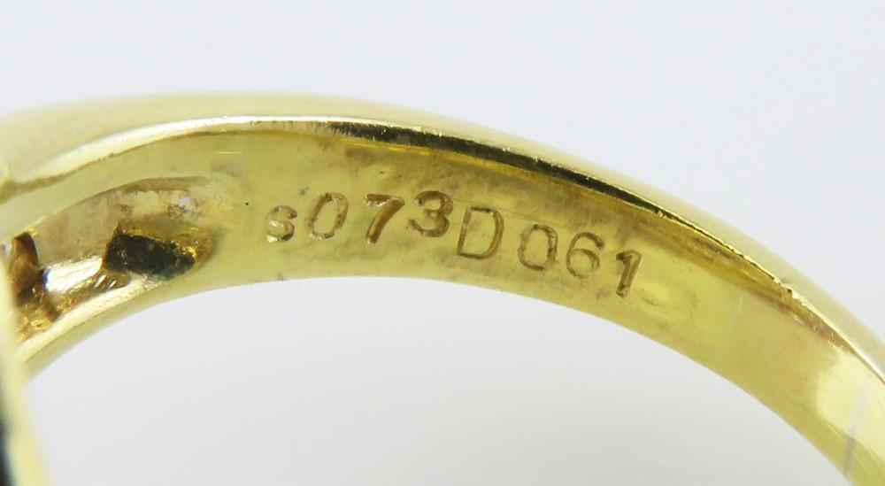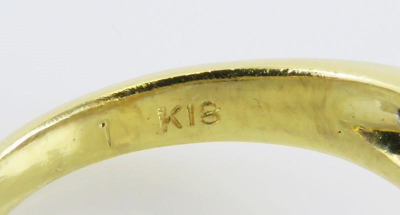 The inside is marked for 18K gold purity and has the carat information for the stones as well. Tested and guaranteed to be 18 karat gold purity.