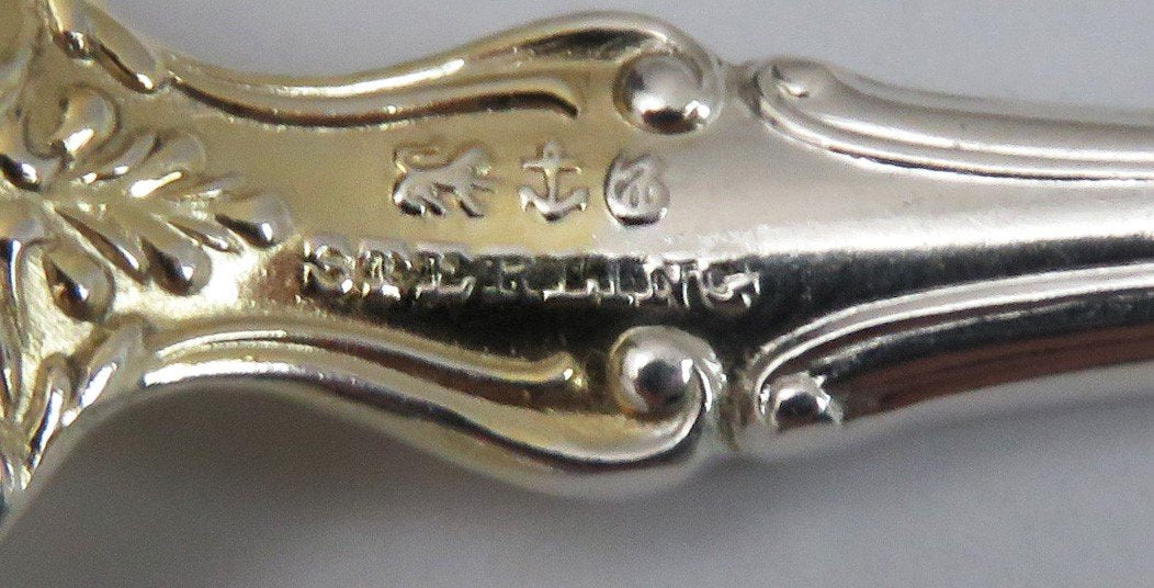 Presented is a nice set of six Gorham sterling silver demitasse spoons. The spoons are done in the Cromwell pattern. The bowls are gilded. The handles have a monogram “KBS” on the front. Let the photos be your guide.