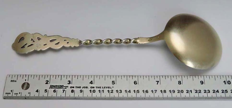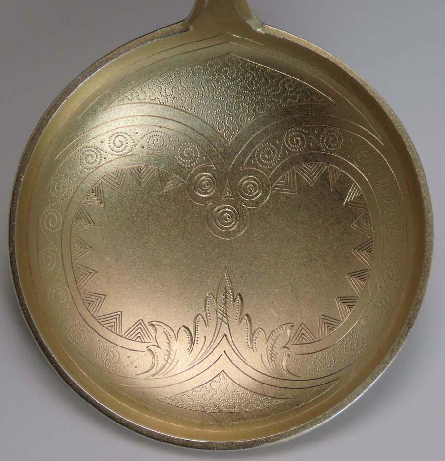 Presented is a nice antique Danish sterling silver spoon. This spoon has a dragon design handle. On the back of the handle there is a monogram “B” most likely for Bibs. There is a light gold wash throughout the whole piece. The bowl is hand engraved. There is a matte finish to the spoon. Let the photos be your guide.