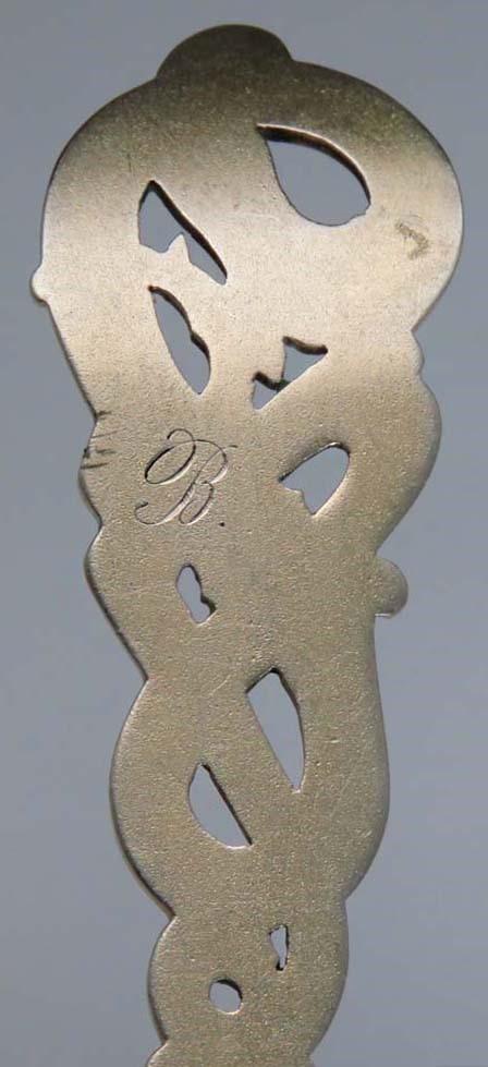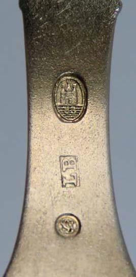 This spoon is marked with the Castle for at least 826 purity silver and the date mark underneath the castle 03 for 1903, “LB” for the maker L. Berth, and the assay mark.