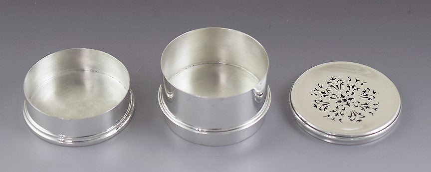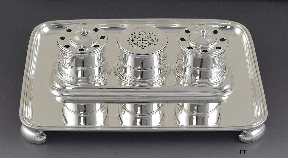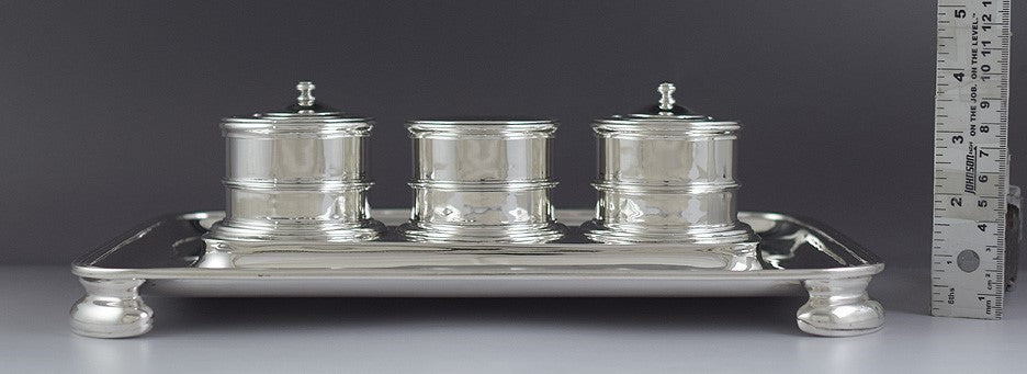 Presented is a superb quality English sterling silver inkwell stand, or standish. This piece dates to 1916 and was made by Crichton. The set consists of a heavy sterling silver tray, with two inkwells and a sander. The two inkwells have an interior glass liner. The sander has a little hidden compartment in the bottom, perhaps for stamps or whatever else you like. The set is very well made, with particularly clever construction for the inkwells, so that the glass liners seat securely into a spot on the inside and the lid holds the glass securely in place. The lid of the sander is decoratively pierced with an ornate, foliate design. The lids of the inkwells have a hole in the center for dipping into the ink, with smaller holes arrayed around the side, perhaps for holding pens? The stand is done in a much older style, emulating simple, elegant Queen Anne pieces from the late 1600s into the first quarter of the 1700s.