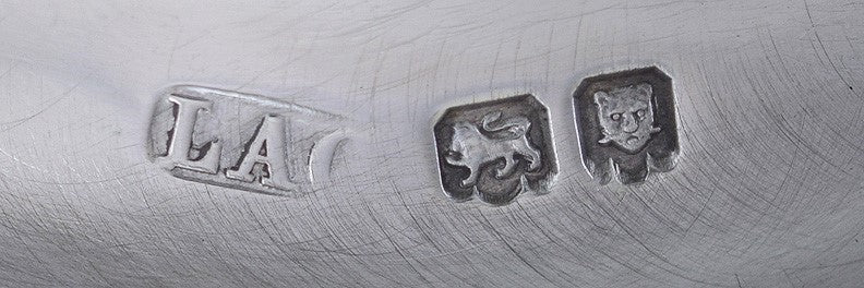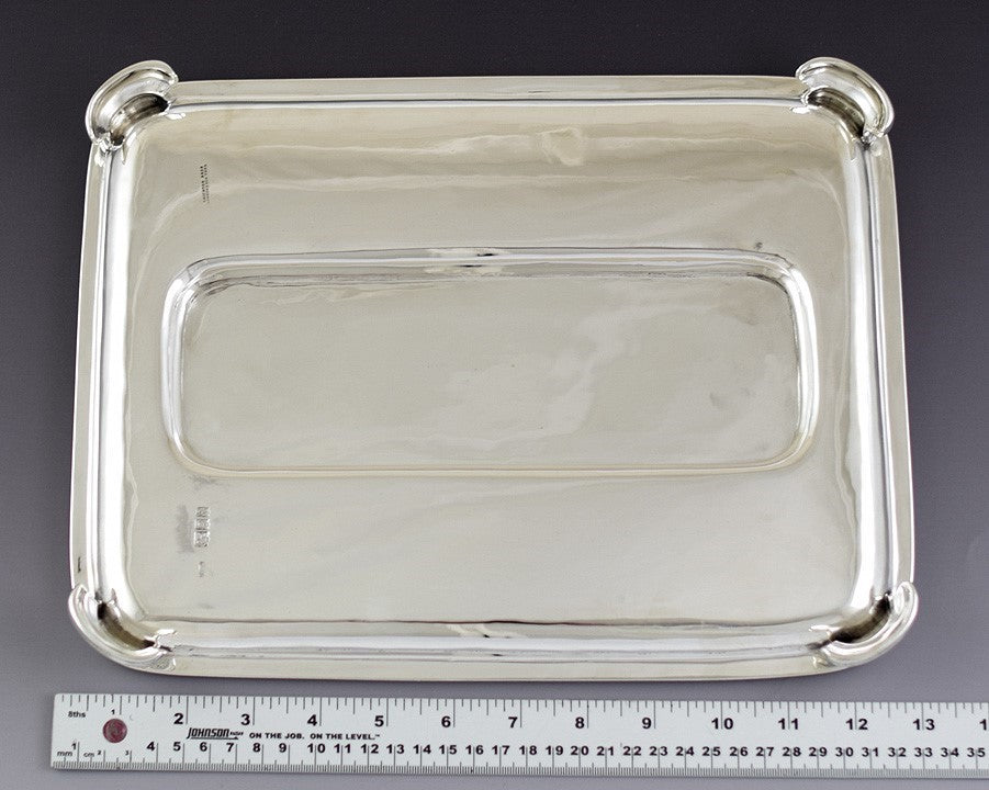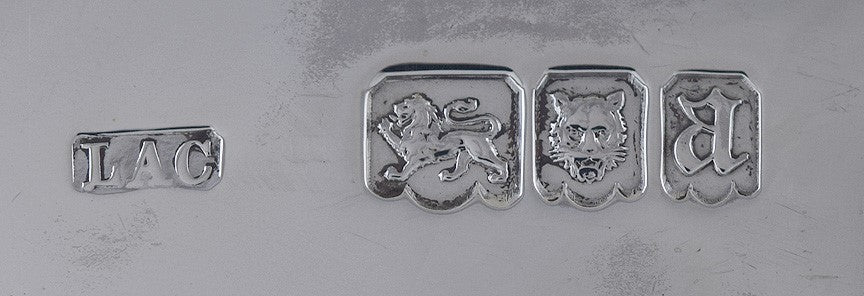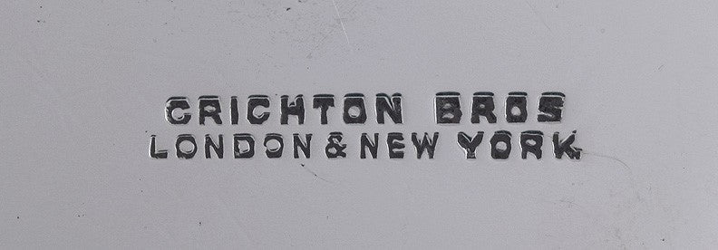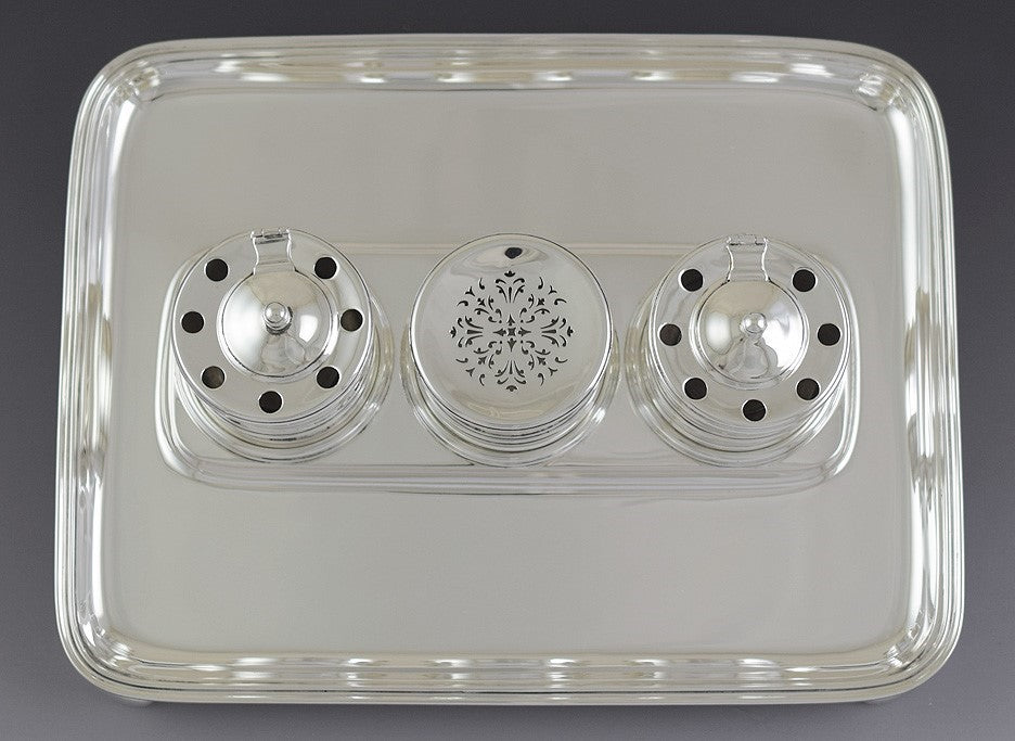 The tray is hallmarked on the underside with the lion passant for sterling silver, the leopard's head for the city of London, the date letter A for 1916, and the maker's mark for the Crichton Bros (Lionel Alfred Crichton). There is also a Crichton Bros London & New York stamp. Each of the inkwells is stamped on the underside with the lion passant, the leopard's head, the date letter A, and the maker's mark LAC. Both the little hinged lid and the overall lid that comes off are stamped with the lion passant, the leopard's head, and the LAC maker's mark, on both inkwells. The underside of the sander is is stamped with the lion passant, the leopard's head, and the date letter A, and the interior of the lid is stamped with all three of these marks as well. The interior compartment of the sander is stamped with the lion passant, the leopard's head, the date letter A, and the LAC maker's mark. Every piece is hallmarked and original.