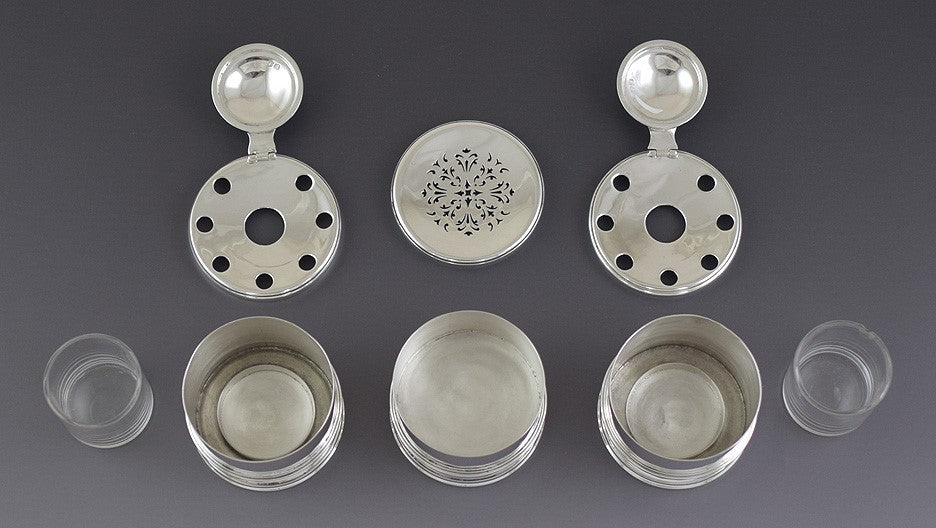 This desk set is in excellent overall condition. One of the glass liners has a tiny chip to its rim, but this is not visible without dismantling the inkwell, as the glass is on the interior. Otherwise both glass pieces are in great shape. The silver has no splits, no dents, no monograms, no monogram removals, and no repairs.