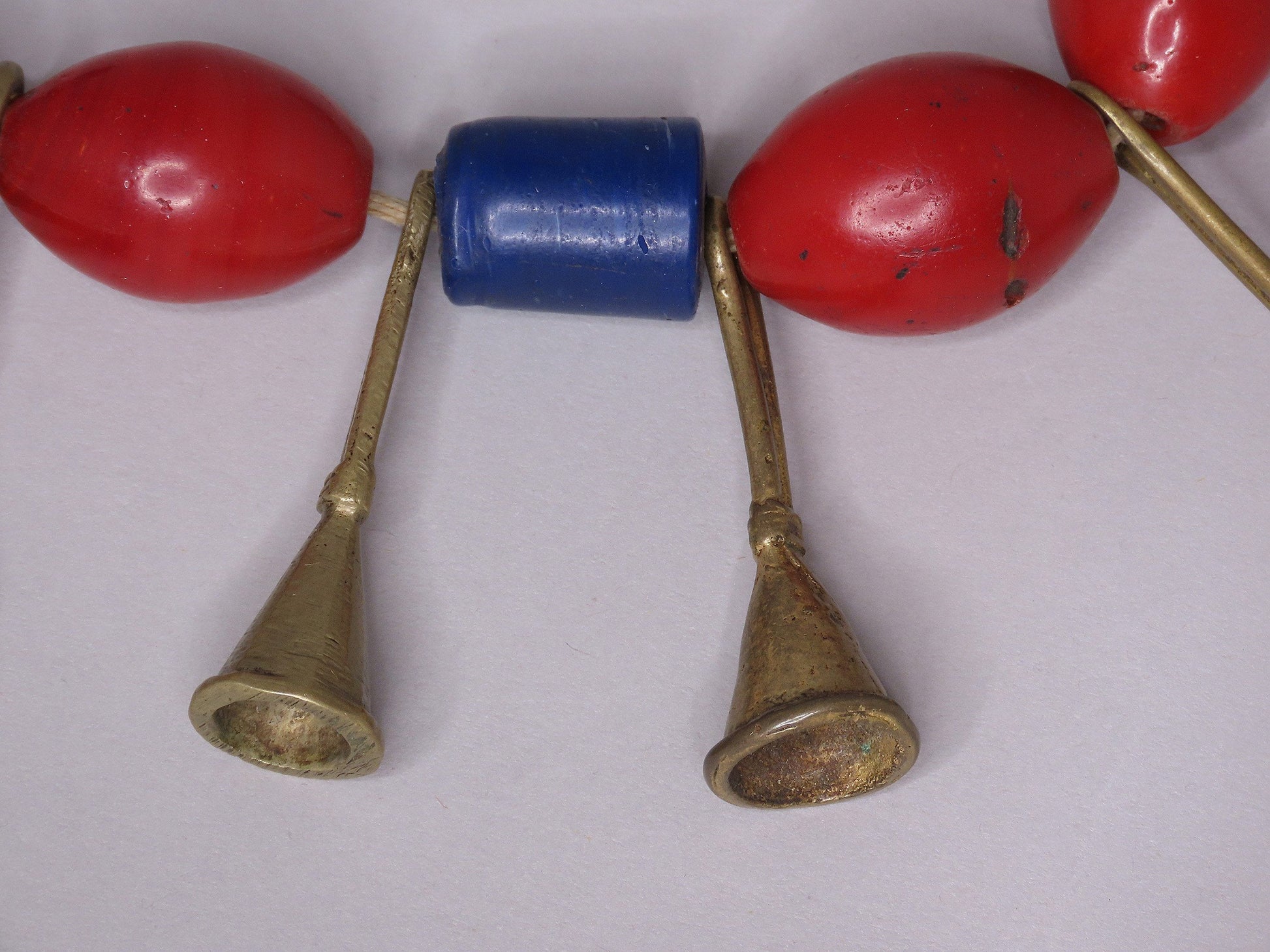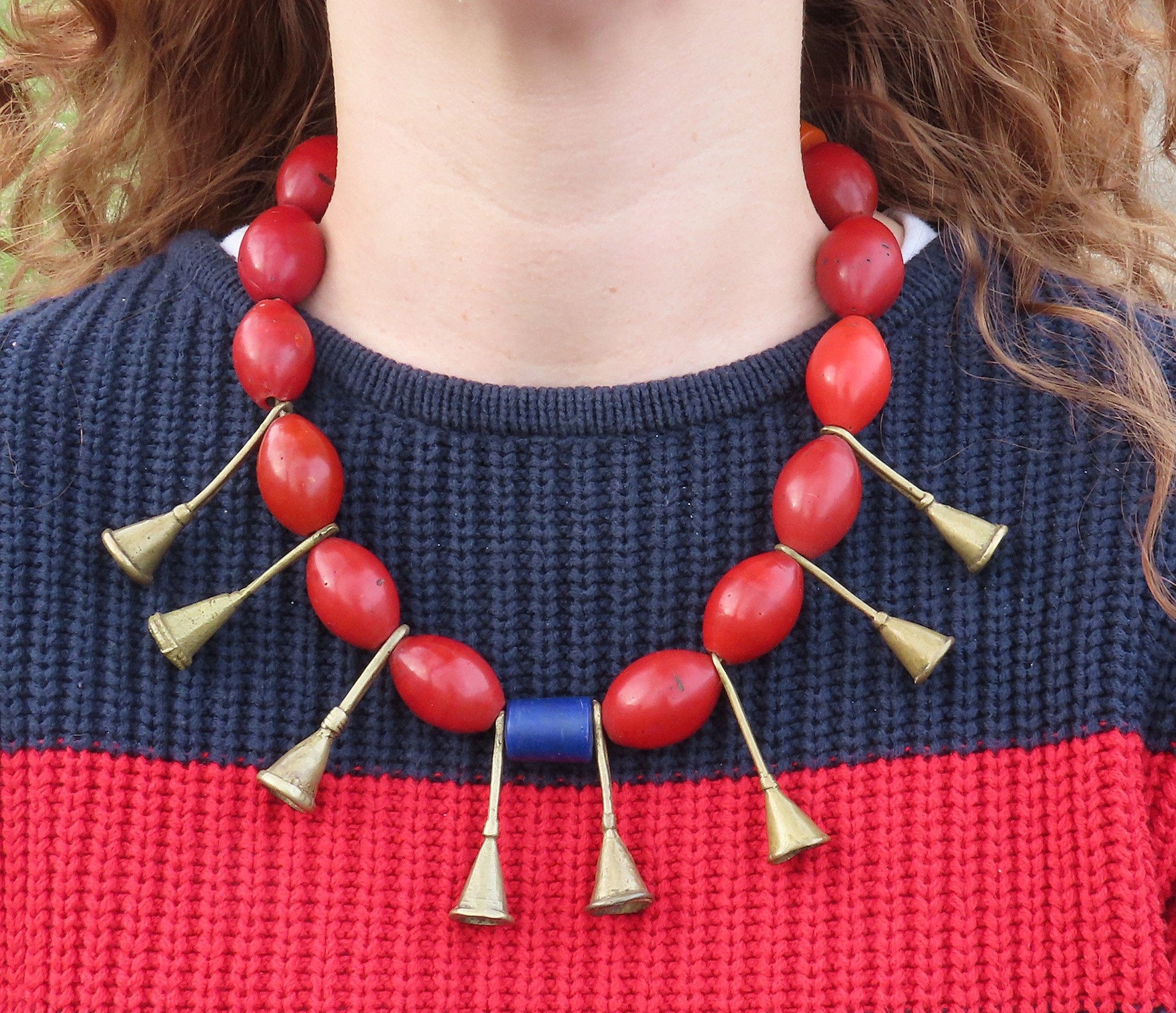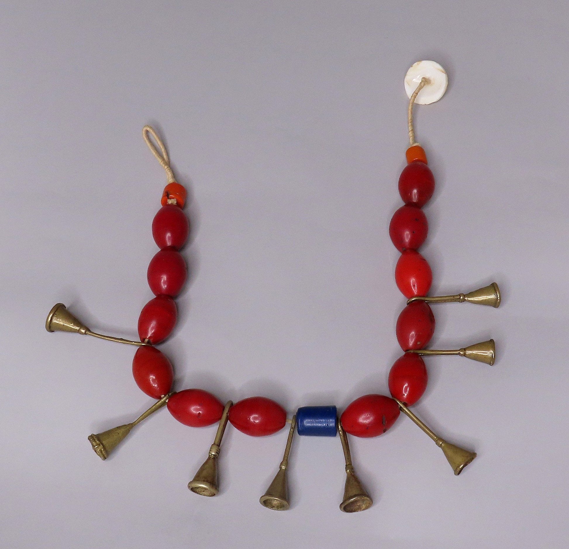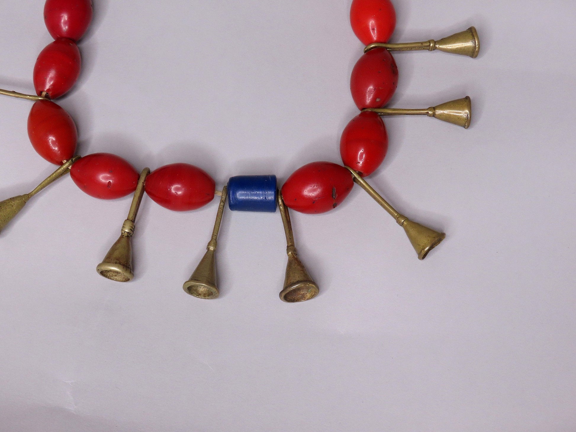 Presented is an interesting beaded necklace, likely an African-style from the 1960s-1970s. This piece displays nice red glass beads with metal horn-shaped beads in-between. The beads are strung on a heavy cloth sting. The necklace has a singular blue bead at the center of the necklace. The closure is a button toggle clasp.