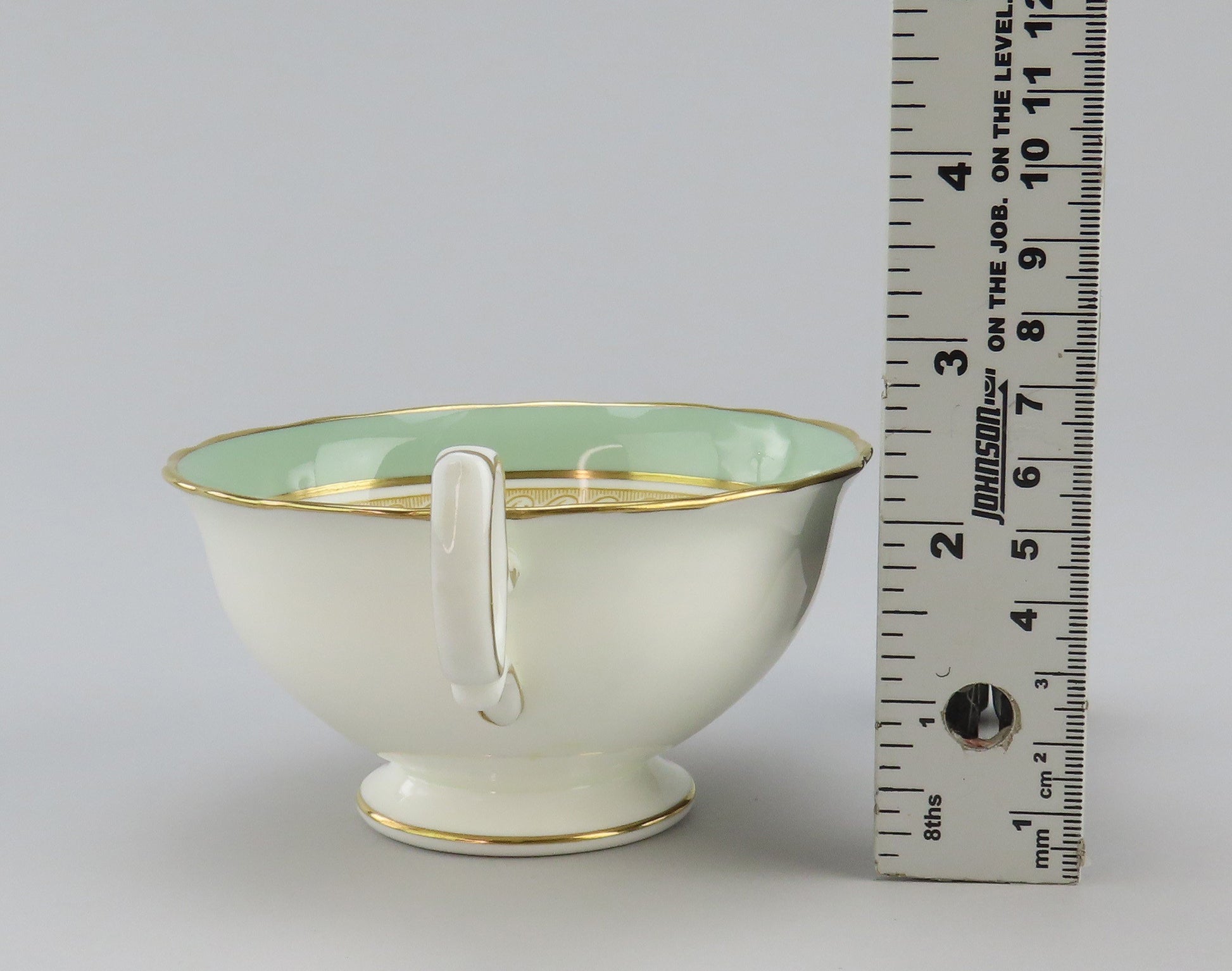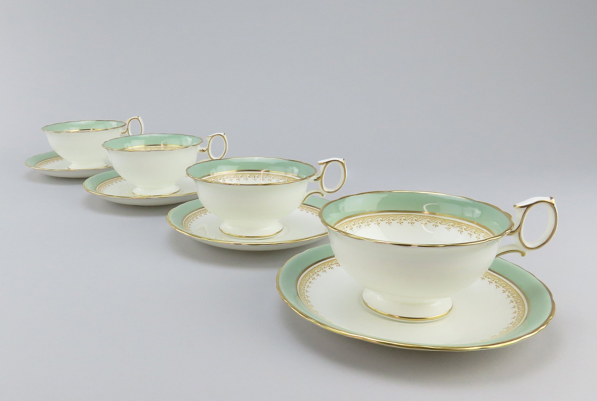 Presented is a set of 4 bone china cups and 5 saucers from Wedgwood. This set is in the Eccles Bead Celadon pattern, which was only in production between 1962-1964. This pattern displays a gorgeous turquoise border with a gilded edge and delicate gold decorations. These decorations are on the border of the saucer and the interior border of the cup.