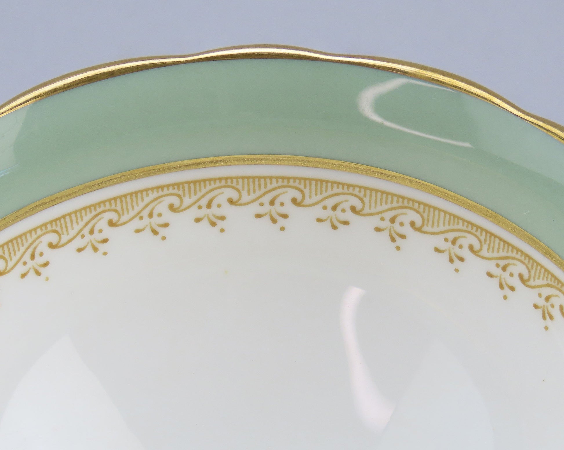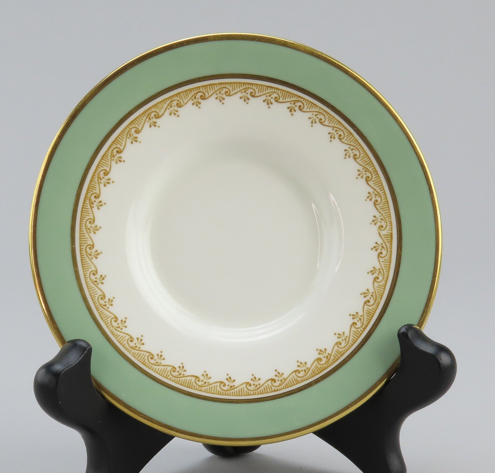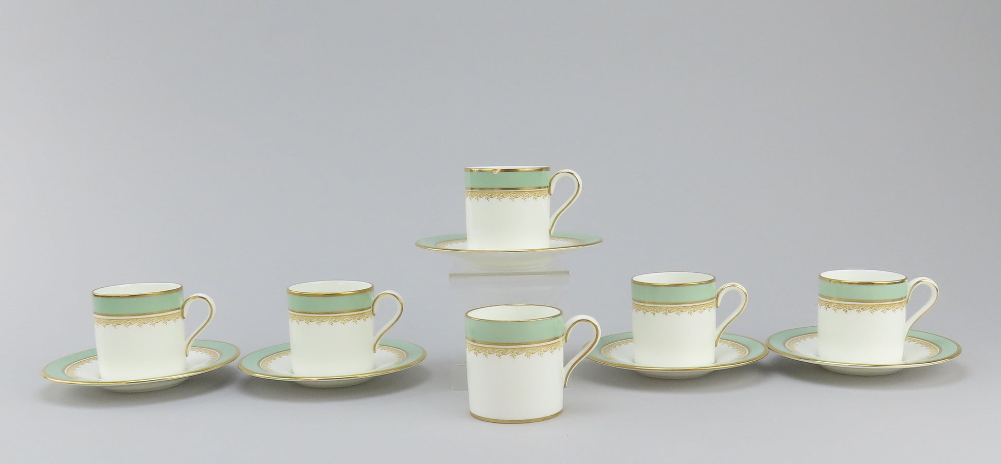 Presented is a set of 6 bone china demitasse cups and 5 saucers from Wedgwood. This set is in the Eccles Bead Celadon pattern, which was only in production between 1962-1964. This pattern displays a gorgeous turquoise border with a gilded edge and delicate gold decorations. These decorations are on the border of the saucer and the exterior boarder of the cup.
