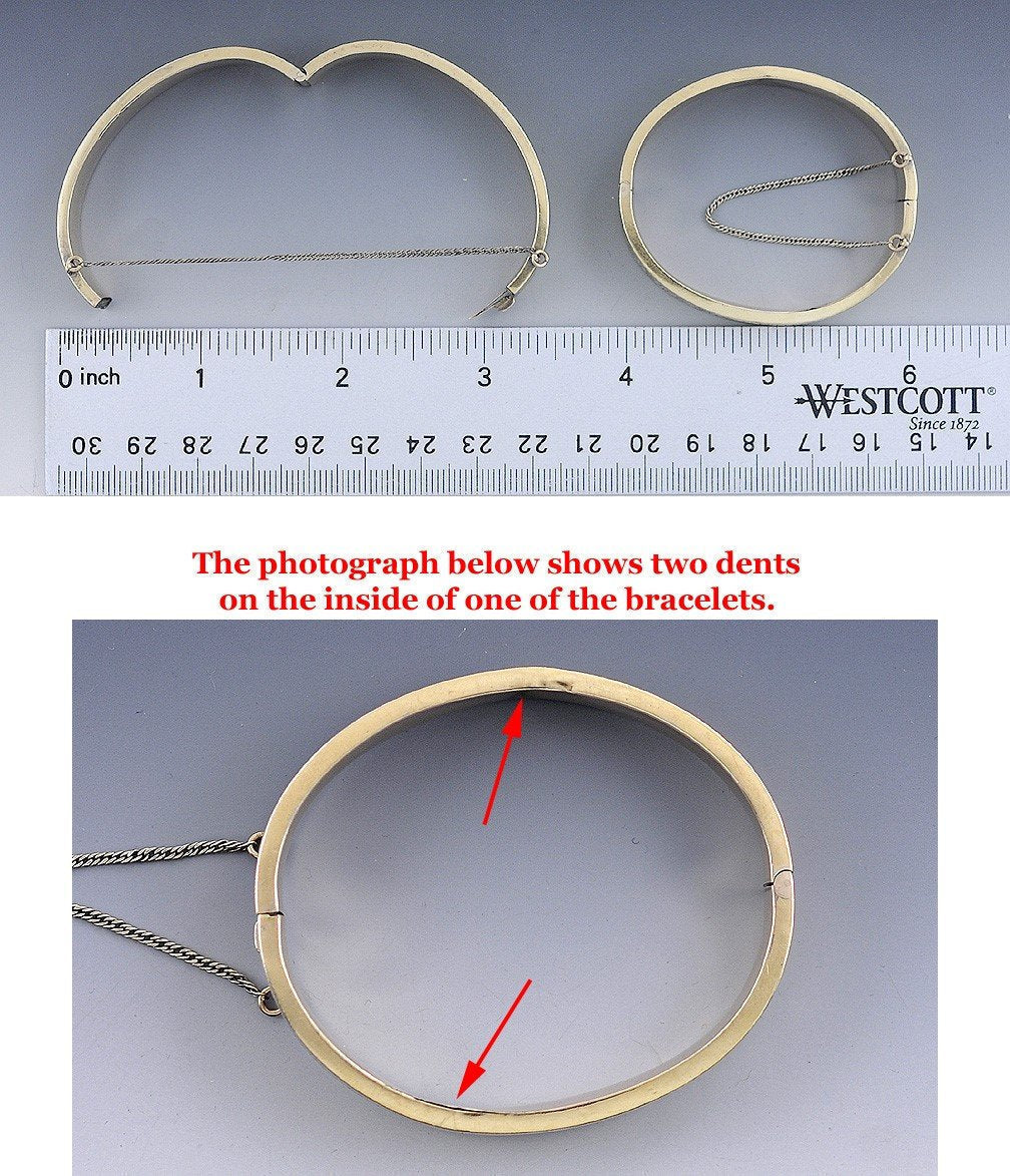 side. The other bracelet has no dents. The inside edge of the bracelets has some