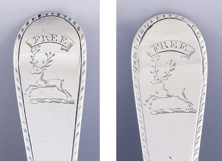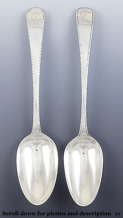 Presented is a fabulous pair of English Georgian sterling silver serving or table spoons. These spoons date to 1775 and 1777. The spoons have lovely classical engraving on the sides of the shaft. The handles have a distinctive downward turn at the end. The end of both handles has a wonderful crest of a stag beneath a banner that reads 'Free.'