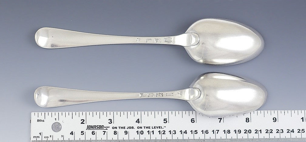 One spoon is hallmarked on the underside with the lion passant for sterling silver, the leopard's head crowned for the city of London, the date letter B for 1777, and the maker's mark of TN possibly for Thomas Northcote. The other spoon is hallmarked on the underside with the lion passant for sterling silver, the leopard's head crowned for the city of London, the date letter U for 1775, and the maker's mark of WF possibly for William Fearn.