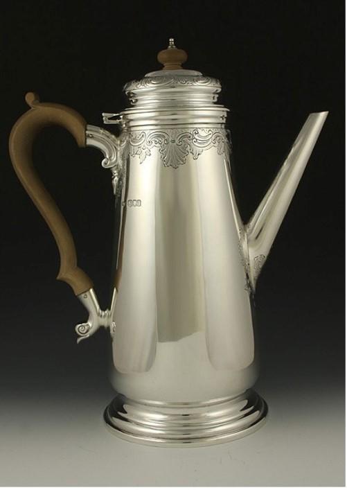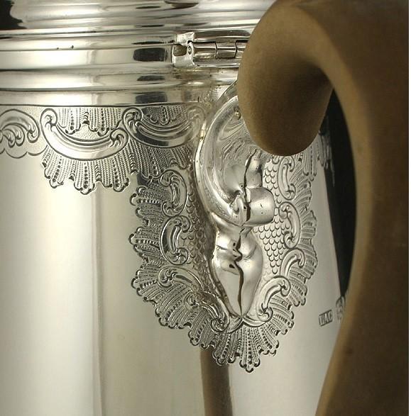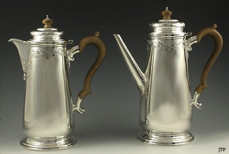 Presented is a handsome, substantial and heavy pair of English sterling silver pots made by the highly regarded London silversmith, Lionel Alfred Crichton. The coffee pot and teapot, or perhaps a hot water pot, are both beautifully crafted in traditional lighthouse form with an elegant border of chased scrolls and flourishes on the lid and below the rim. The pots have nicely turned wooden handles and finials. Both pieces are faithful copies of pots that were originally made in the first half of the 1700s. Top quality work by one of the best makers in England. Both pieces are exceptionally well made and have good weight for their size. The pots have never been monogrammed or engraved.