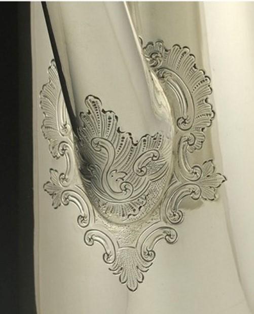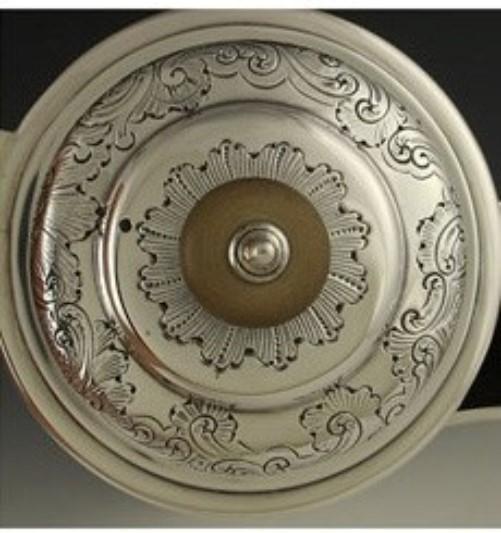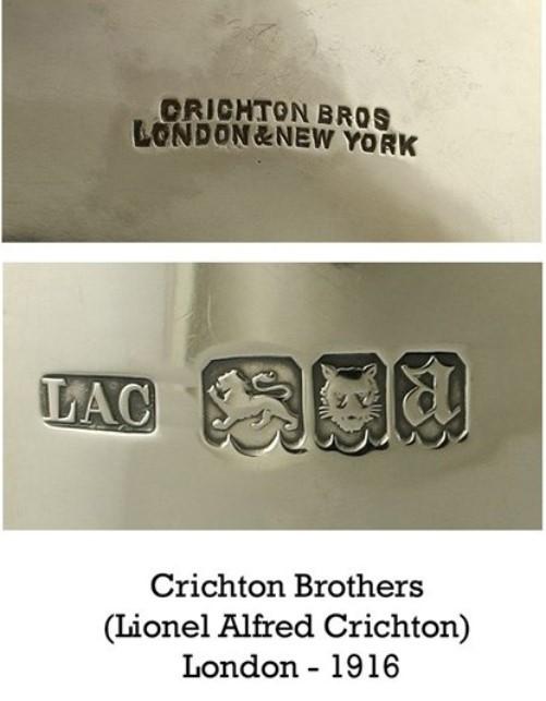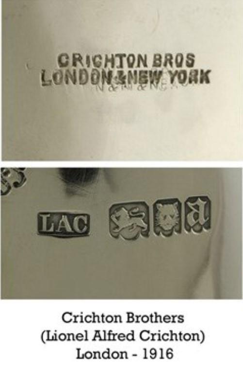 Each piece is hallmarked below the rim with the lion passant for sterling silver, the leopard’s head for London, the date letter ‘a’ for 1916, and a maker’s mark of LAC for Lionel Alfred Crichton. Both pieces are also hallmarked on the inside of the lid and even on the wingnut that holds the finial in place.