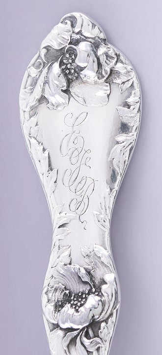 The spoons are in great condition. The details of the pattern are nice and crisp. There are no splits, no dents, no breaks, no monogram removals, and no repairs.
