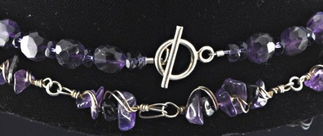The other necklace features rough tumbled genuine amethyst and onyx stones with silver wire twisting around the stones in a neat way. It is 20 1/2 inches long.