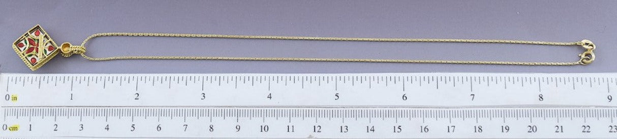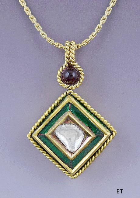 Presented is a beautiful high karat gold, ruby, diamond and enamel pendant on an 18 karat gold chain. The pendant is a modern Indian copy of older Mughal style pieces. The front of the pendant is decorated with rich green enamel, set with a diamond in the center and a round ruby on the bail. The diamond is polished but irregular in shape, so it is hard to measure, but it is a good size. The pendant is decorated on the back with green, red and white enamel in a floral design. The pendant comes with an Italian 18 karat gold chain, very simple and stylish.