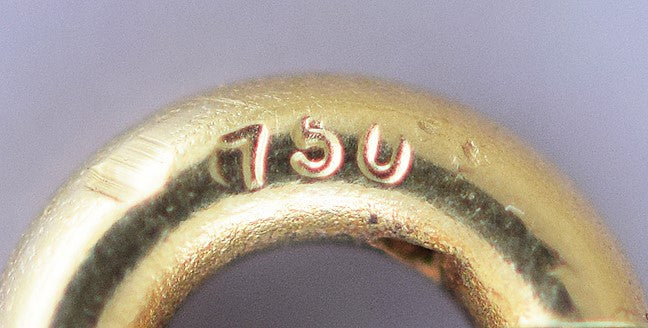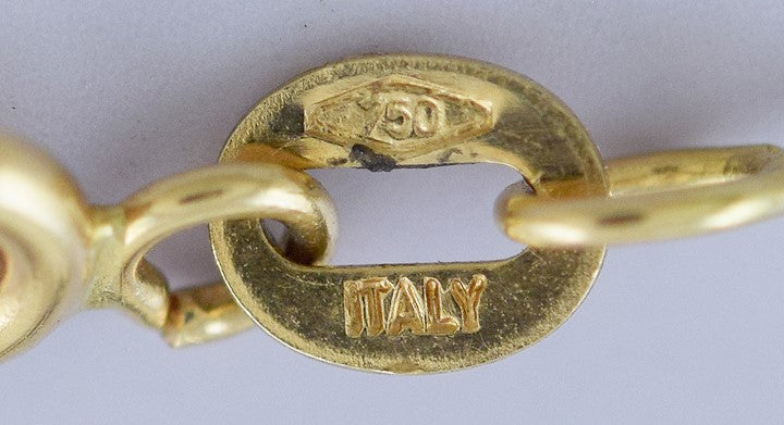 The back of the pendant is stamped Nur and 20-22kt. The chain is marked on the clasp with Italian marks, including 750 for 18 karat gold.