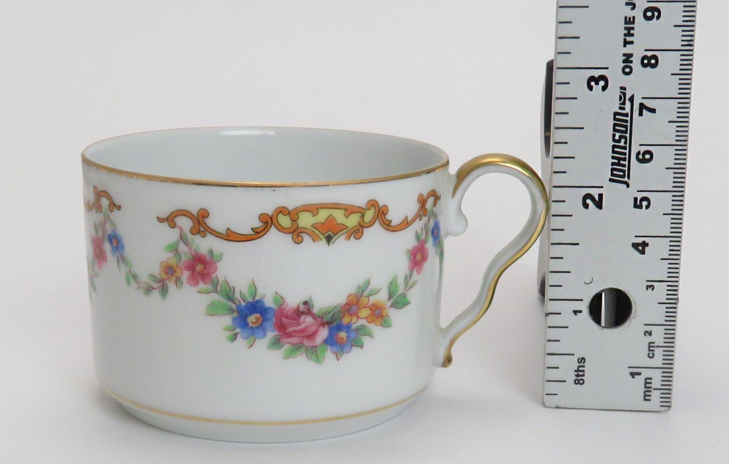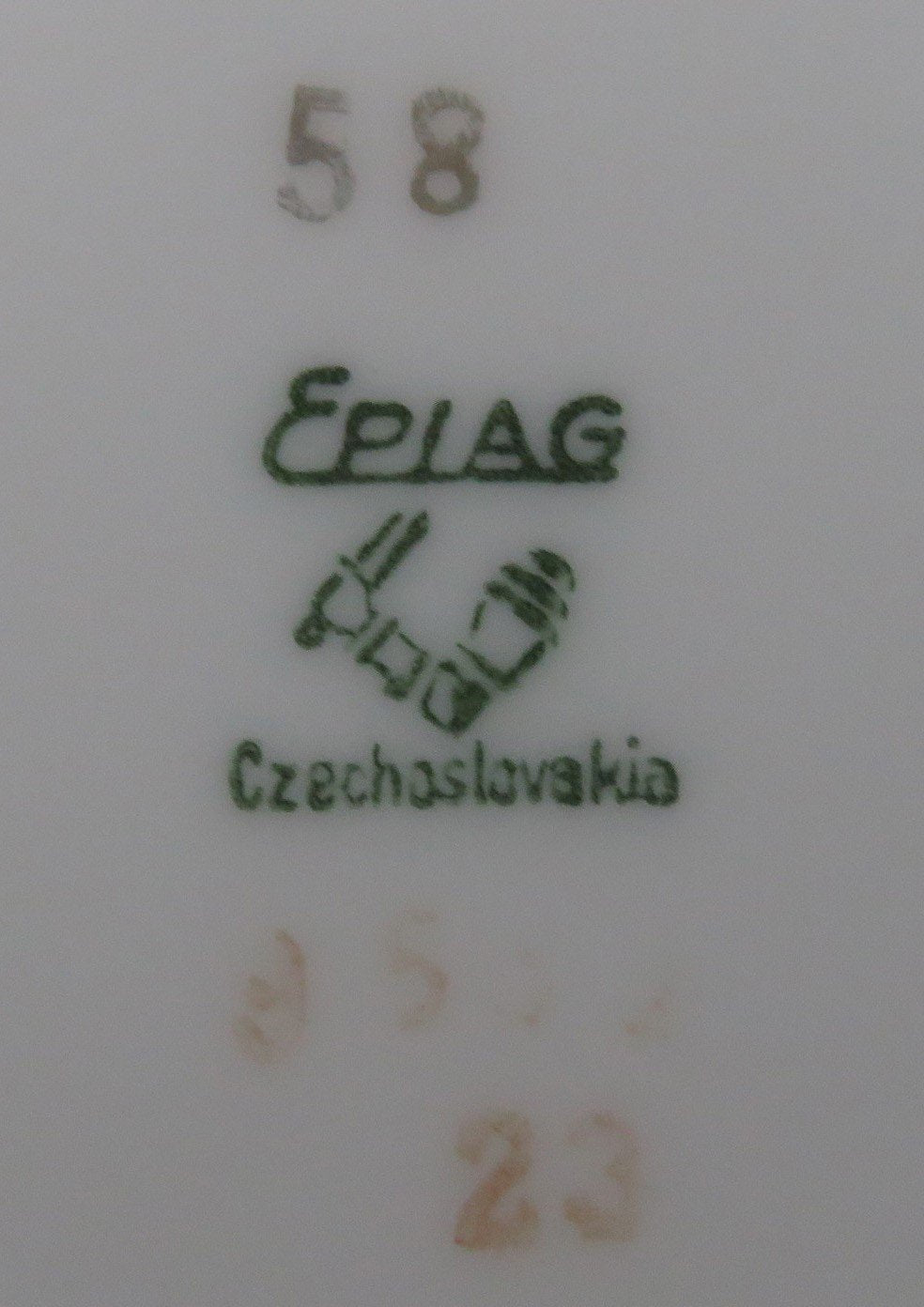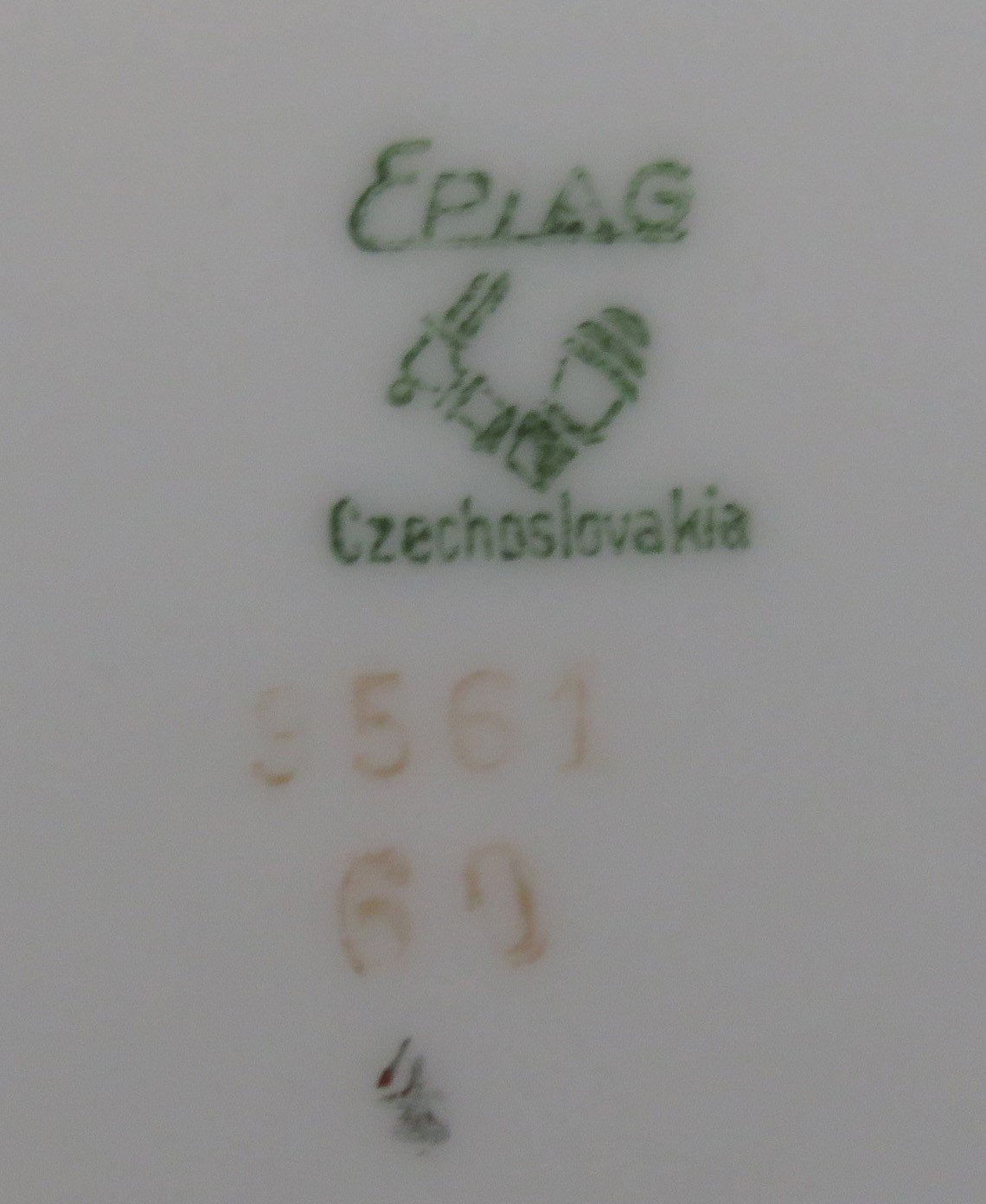 Presented is a lovely set of Czech porcelain cups and saucers, by Epiag. This set dates to around the 1930s. The set consists of nine cups with eleven saucers, so you have a couple of extra saucers just in case. The pieces are made in the pattern numbered 9561. This pattern features colorful floral swags beneath intricate scrollwork designs, against a white ground. The cups and saucers have nice gilt rims and detailing. Each piece is marked Epiag, Czechoslovakia, and the pattern number 9561.