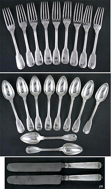 Presented is a great 21 piece set of Italian silver flatware, made in the early 1800's. The set is done in the Fiddle Thread pattern. Everything is completely hand done. This set was not struck with a die. All the pieces are very large and have tremendous weight. The knives have English carbon steel blades. They were probably rebladed in England many years after they were originally made in Italy. Each piece is monogrammed GT on the reverse. This engraving is undoubtedly original.