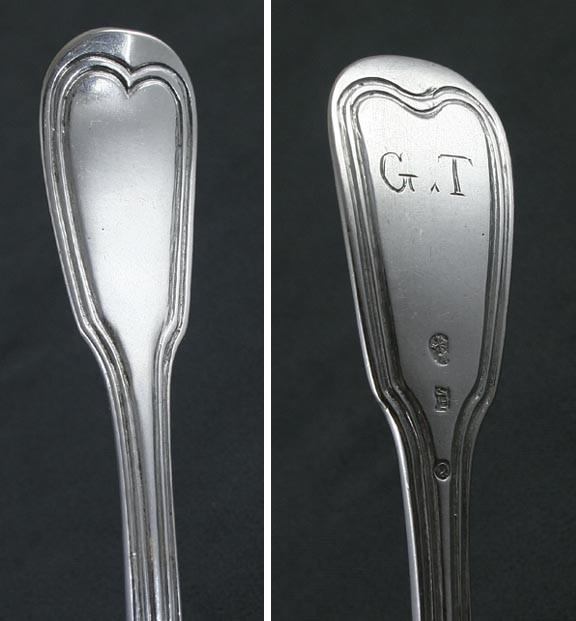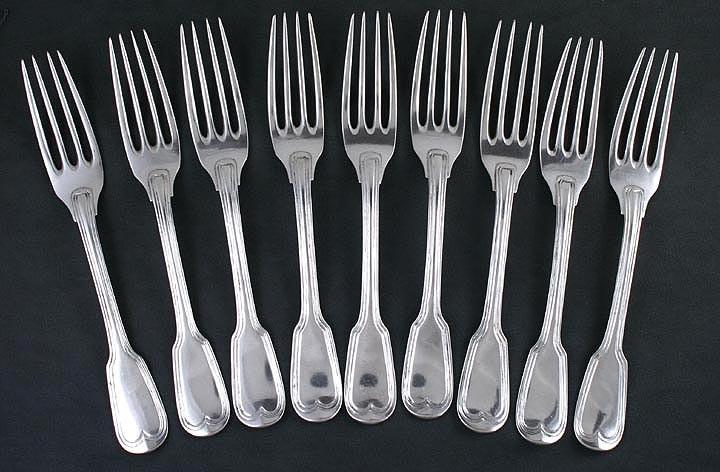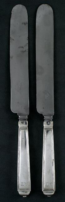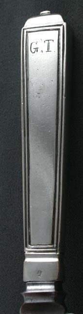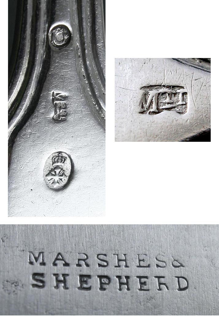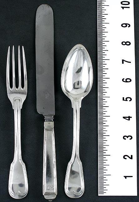 Each piece is hallmarked with a cross beneath a crown for the city of Nice. This mark was used in the late 1700s. Each piece is also hallmarked with a fish mark and a maker’s mark that appears to be MTT. These pieces are solid silver and not silverplated. They are guaranteed to be a minimum of 812 purity silver, but appeared to test to be 900 purity silver. The condition is excellent. There is some wear commensurate with age and light use and the knives have been rebladed, but this is minor. Everything is useable. There are no dents, no splits, and no breaks.
