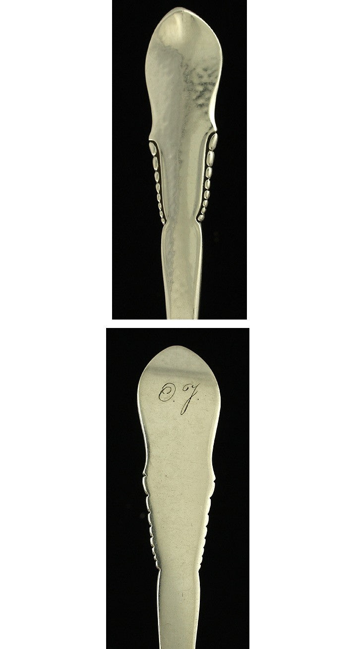 Presented is a fine set of 3 Danish silver forks. The forks have a nice hand hammered finish. Each fork is decorated with a partially beaded rim. They are monogrammed OJ or OY on the back of the handles. Each fork has solid construction and is well made.
