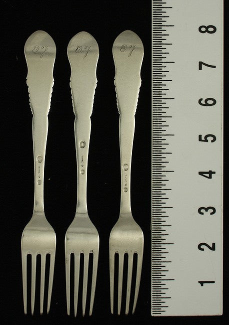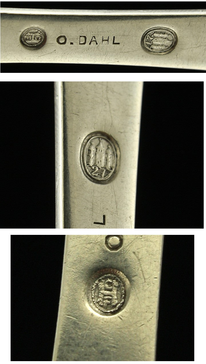 The forks are hallmarked on the reverse with the three towers mark for Danish silver, the number 27 under the towers for the date 1927, an assay master’s mark, and a retailer or maker's mark of O. Dahl. These forks are 830/1000 parts pure silver, they are not silver plated.