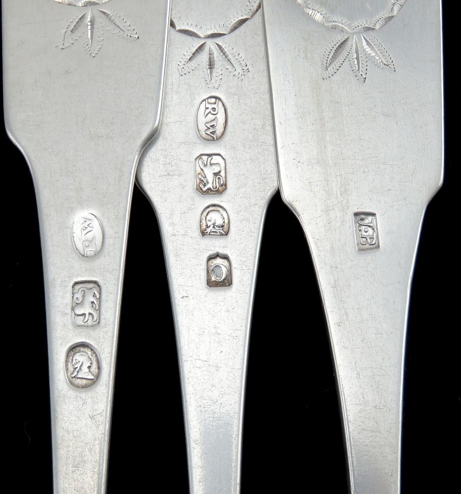 There are no monograms on the fronts of the handles, but the backs are hand engraved with a script "M" or "ML". The back of the forks are also stamped with silver maker's marks. On two forks, the maker's initials are "R.W" for Robert Wilson in Philadelphia during the production period 1803-1810. The other fork is stamped "J:B", most likely by John Brown, another Philadelphia silversmith during the same period.