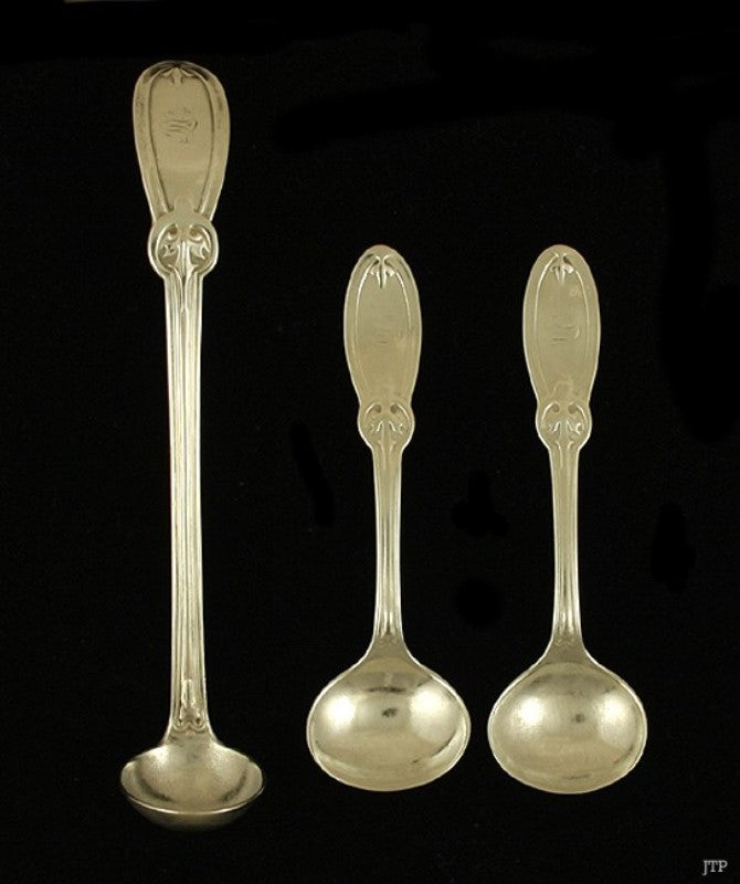 Presented is a fine pair of sterling silver master salt spoons and a matching mustard ladle made or retailed by Ball, Black & Company, predecessors to Black, Starr & Frost. This firm was active from 1851 to 1874. The salt spoons and mustard ladle are all done in a wonderful Gothic design. This pattern is a variant of the Gibney pattern which was patented by Whiting in 1862. All three pieces are engraved with LH in a fancy script on the fronts of the handles, although the monogram is largely worn on the two salt spoons. The mustard ladle is also engraved on the back of the handle with J.R.K.