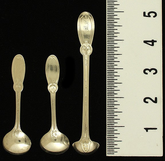 The condition is excellent. All three pieces have minor surface wear commensurate with age and light use. The salt spoons have a good amount of wear. There are no dents, no splits, no breaks, and no repairs.