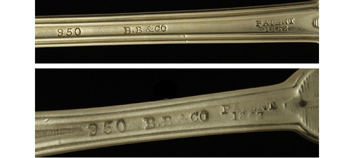 Each piece is marked on the reverse with B.B.&Co. for the maker Ball, Black & Company, Patent 1862, and 950 for the silver purity. This is a slightly higher purity than sterling silver.