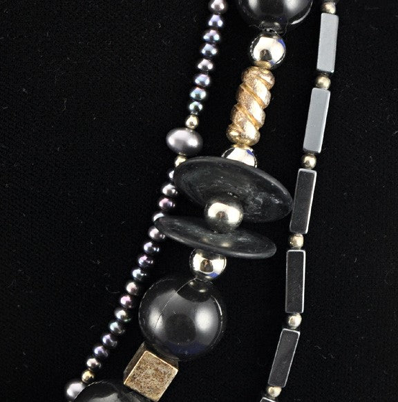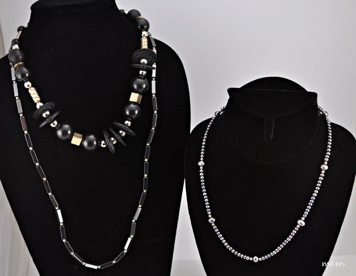 3 necklaces: 1 black pearl necklace, 1 hematite necklace, and 1 black & silver-colored bead necklace
