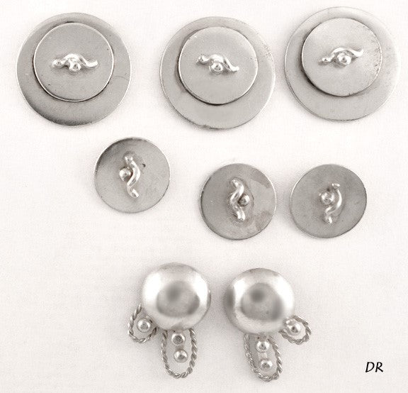 The small, round earrings are very similar in style to the larger earrings. In fact, they are identical in design to the smaller disc in the center of the larger earrings. That being the case, I strongly believe them also to be made by the Thomae Company, but they are not marked, so I cannot be sure. They are not stamped as sterling but are guaranteed to be. They have replacement backs. They are 1/2 inches in diameter.
