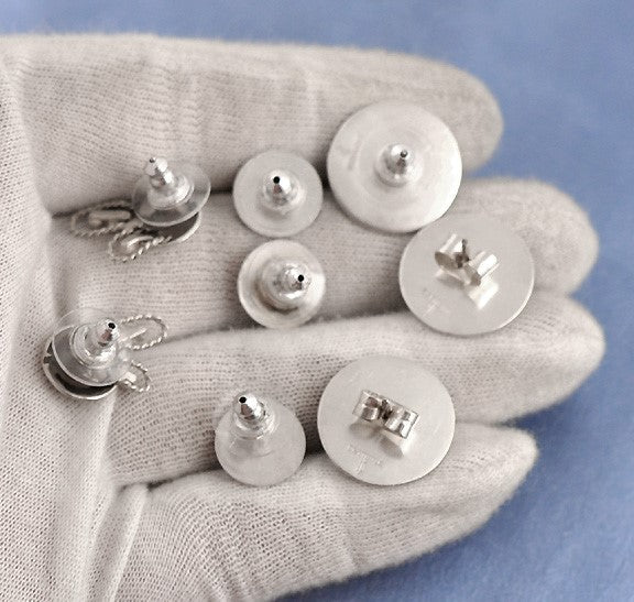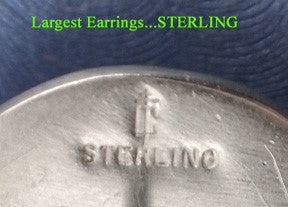 The large, round earrings are made and stamped by the Thomae Company. Two of these larger earrings have their original backs. The other earring has a replacement back. All three of these earrings are stamped "sterling." They are 3/4 inches in diameter.