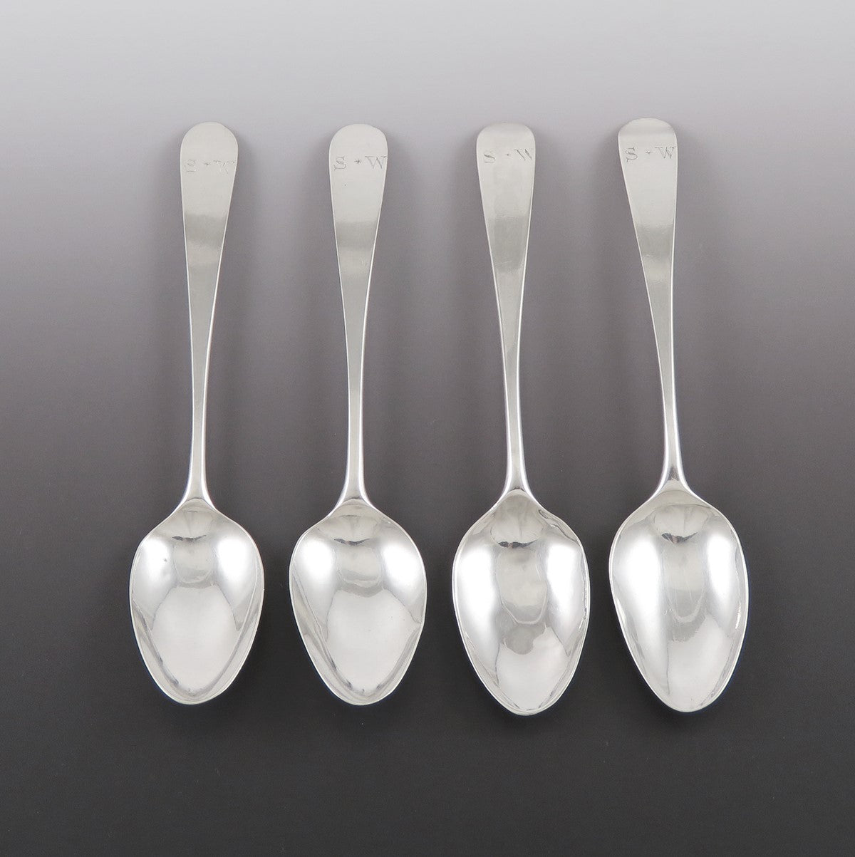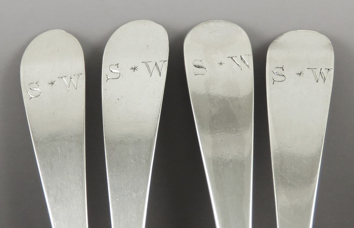 Presented is an antique set of 4 English sterling silver demitasse, tea or coffee spoons made by Hester Bateman of London in 1786. This set is done in a classic form and the front of each handle has a hand engraved monogram of the initials SW.