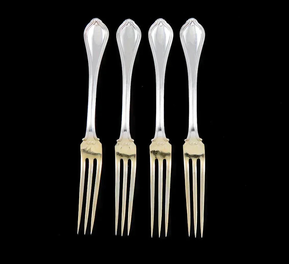 Presented is an antique set of 4 sterling silver strawberry, fruit, cocktail, seafood, pickle or olive forks made by Towle during the early 1900s. This set is done in the Paul Revere pattern, which was patented in 1906. The long tines have a gold wash and the handles have never been monogrammed.