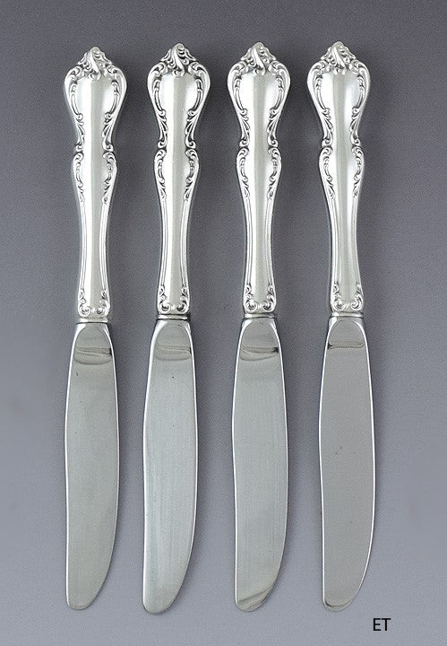 Presented is a nice set of 4 sterling silver butter knives made by Towle. This set is in the Dubussy pattern, which was patented in 1959. Each handle is designed with flourishes along the sides and tip. The blades are all stainless steel.