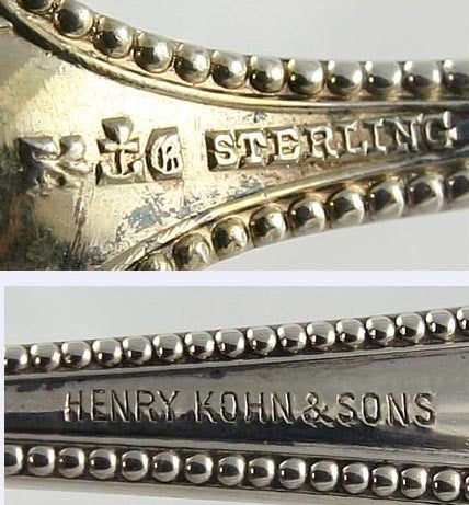 Presented for sale are 4 sterling chocolate or bon bon spoons in the Newcastle pattern by Gorham. These spoons are quite rare and hard to find. This pattern was first manufactured by Gorham in 1900. The reverse side of the handle of each spoon is fully stamped with Gorham's old hallmarks, the word sterling and the retailers stamp of Henry Kohn & Sons. The front and back of the bowls of the spoons have a beautiful gold wash, which shows only the most minor of the wear. The monogram KEG is hand engraved on the handle of each.