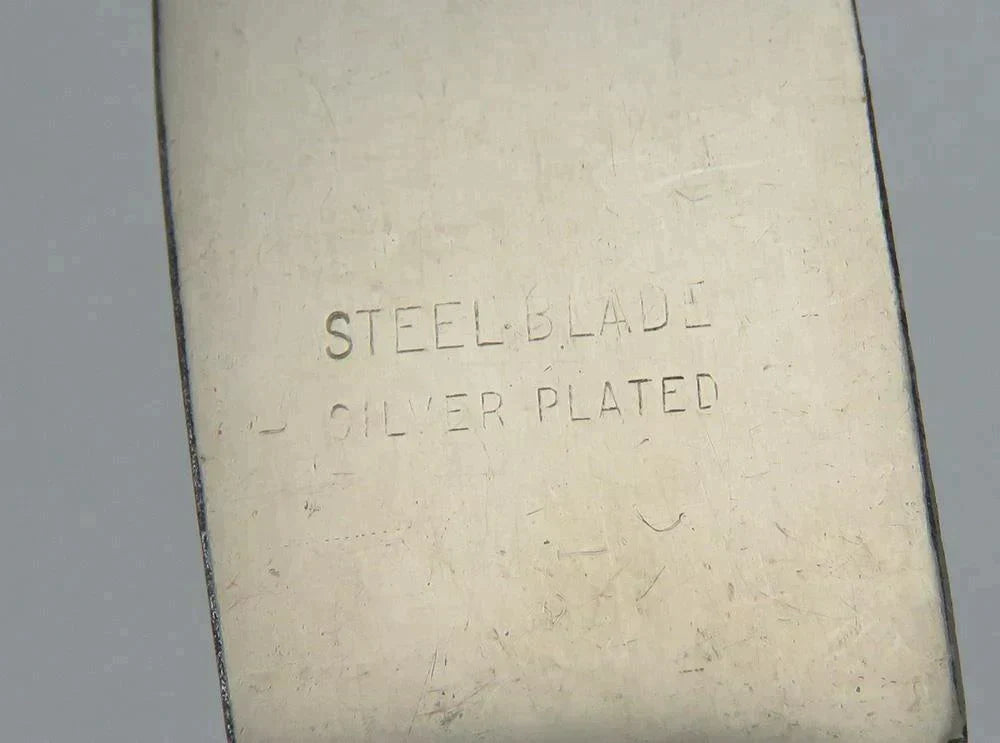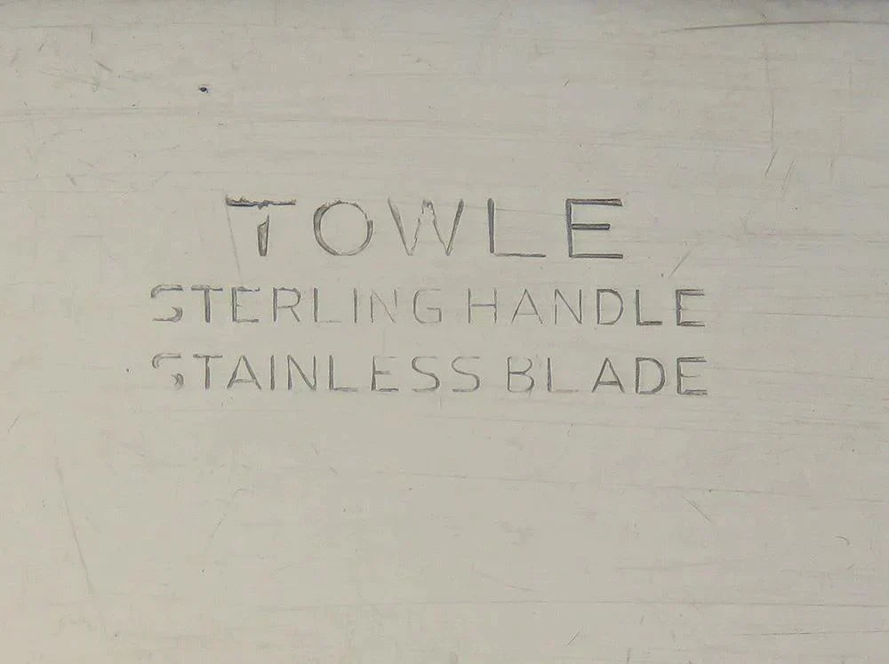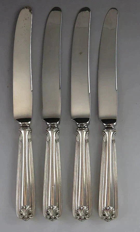 Presented is a fine set of 4 sterling silver knives made by Towle. This set is in the Benjamin Franklin pattern, which was patented in 1904. The sterling silver handles are designed with a threaded edge and shell tip. All of the blades are stainless steel, except for one silver plated steel blade.