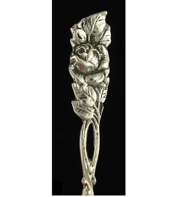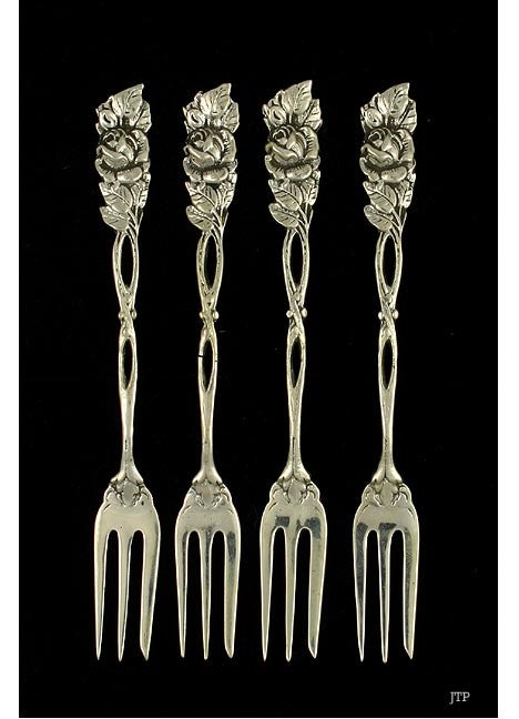 Presented are 4 sterling silver cocktail forks with handles decorated with a lovely pierced rose and vine pattern . They were made in Sweden in 1952.