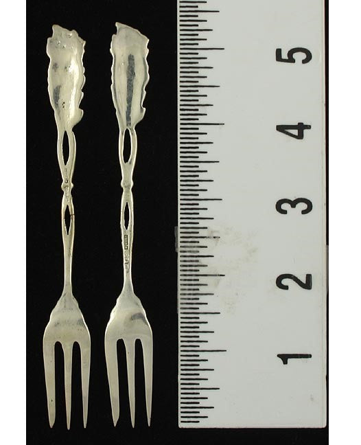 The forks are in excellent condition. Three of the forks are in excellent condition, with no breaks and no splits. One fork has a break in one of the vines in the handles. In the first photo, the fork is the second from the left, and the break is visible on the left side. The other side is intact and in good shape. The underside of the fork is also on the left of the third photo. There are no other breaks, no splits, no monograms, no monogram removals and no repairs.