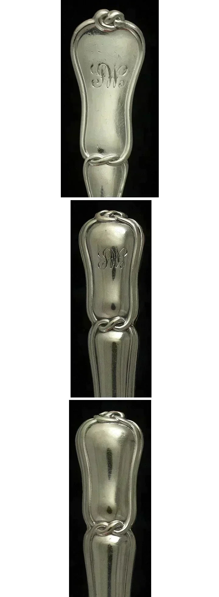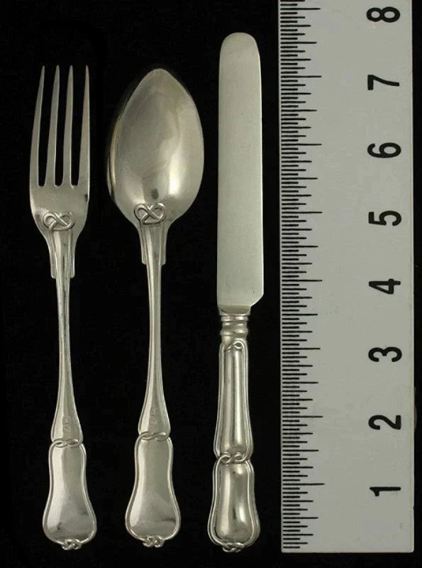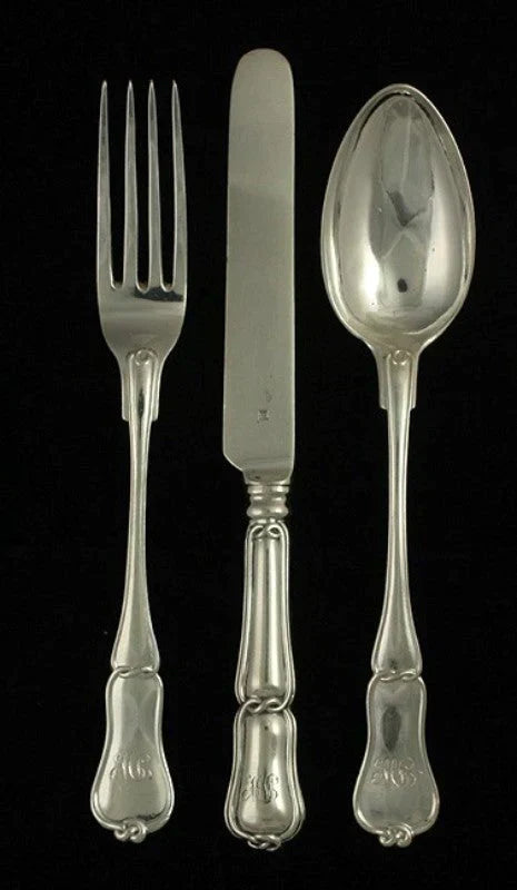 Presented is a German or Austrian silver 46 piece flatware set made during the mid 1800s, between the 1840s to the 1870s. This set is in a sort of French Knot or Knotted pattern, which has a full knot accent at the tips and a half knot design in the middle of each handle. All of the pieces have a monogram of the initials SW. The knives in this set are completely silver, the blades included (they are also stamped). 3 out of the 16 knives have replacement blades, which we believe to also be silver, and the handles appear to be solid silver, instead of the rest of the knives which are hollow silver handles. None of the knives appear to have any pitch or cement in the handles. In short, all of the weight in the knives are silver.