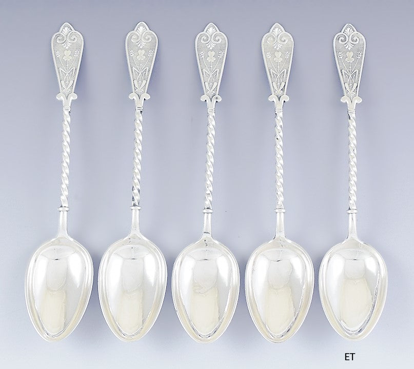 Presented is a fabulous set of 5 Norwegian silver soup, place, or dessert spoons. These spoons date to 1879 and were made by David Andersen. The spoons have an elegant twist form stem. The terminal of the handle features a design of crossed stalks of wheat, with a flower and what looks like a maple seed, all against a textured background. The back of the handle is smooth, and could easily be monogrammed or presented.
