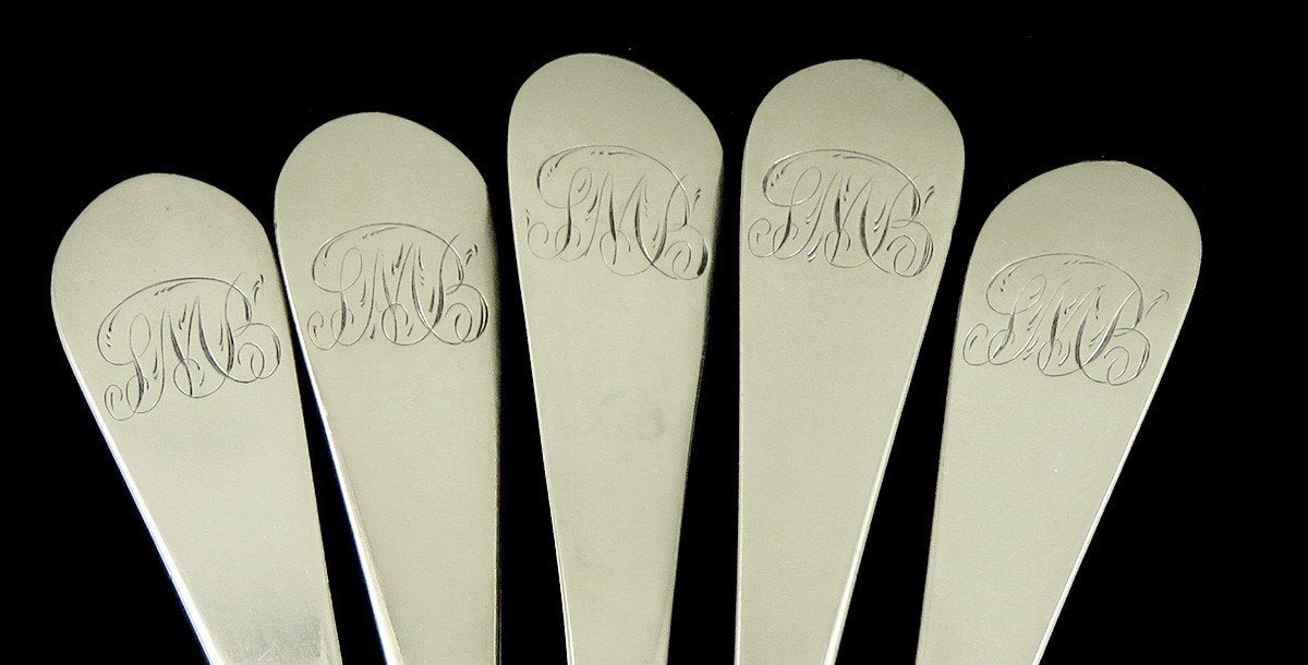 Presented is an antique set of 5 American coin silver teaspoons made by Samuel Richards of Philadelphia between 1790 to 1810. The front of each handle has an old, original monogram of the initials SMP.