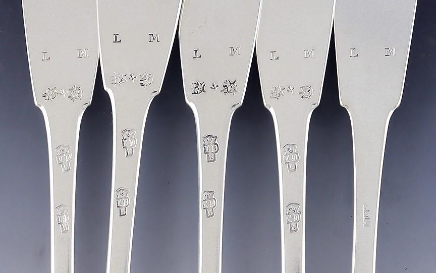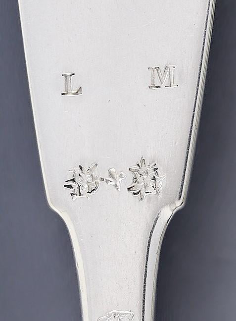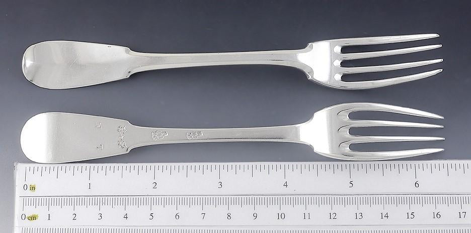 Presented is a great set of 5 European silver forks. These forks date to around the late 1700s or early 1800s. We do not know the maker of the forks or the origin, but they are certainly continental European, possibly Belgian or Swiss. The forks are done in a very simple and classic style, with an upward turn at the end of the handles. The back of the handles have an old monogram of LM, above two star shaped marks.