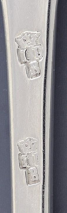 Each of the forks is marked twice with a maker's mark of IDB. There may be other hallmarks that were overstruck by the star marks on the handles. The silver is 830-900 purity.