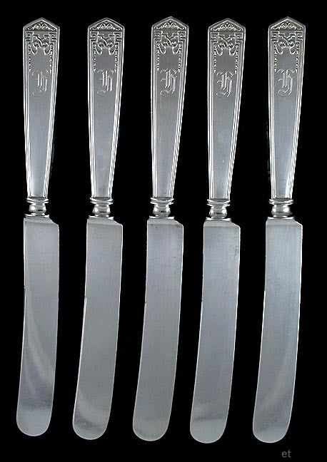 Presented is a handsome set of 5 sterling silver dinner size knives by International. The knives are done in the Devonshire pattern which was first produced in 1914. The knives have sterling silver handles and silver plated carbon steel blades. They are monogrammed with an H in Gothic script.
